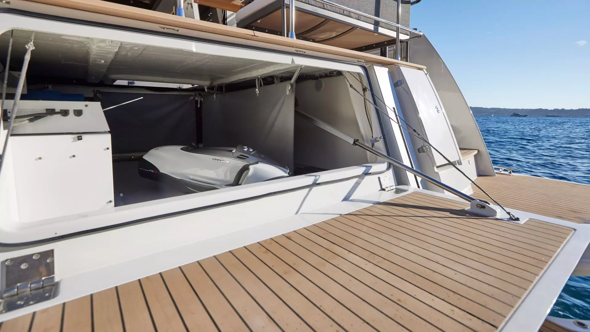 Lijepo zaokružen dizajn daje brodu skladan izgled i sprječava da djeluje previsoko u odnosu na svoju dužinu. Iznad pomične krmene platforme, koja se može podići gotovo do razine glavne palube ili spustiti ispod površine mora, nalazi se duga teleskopska pasarela koja vodi izravno na krmeni dio palube, koji je natkriven i dobro zaštićen od vjetra, a nudi udoban smještaj za goste na dvije pomične L-sofe uz rasklopive stolove, stvarajući savršeno mjesto za objedovanje u hladu.