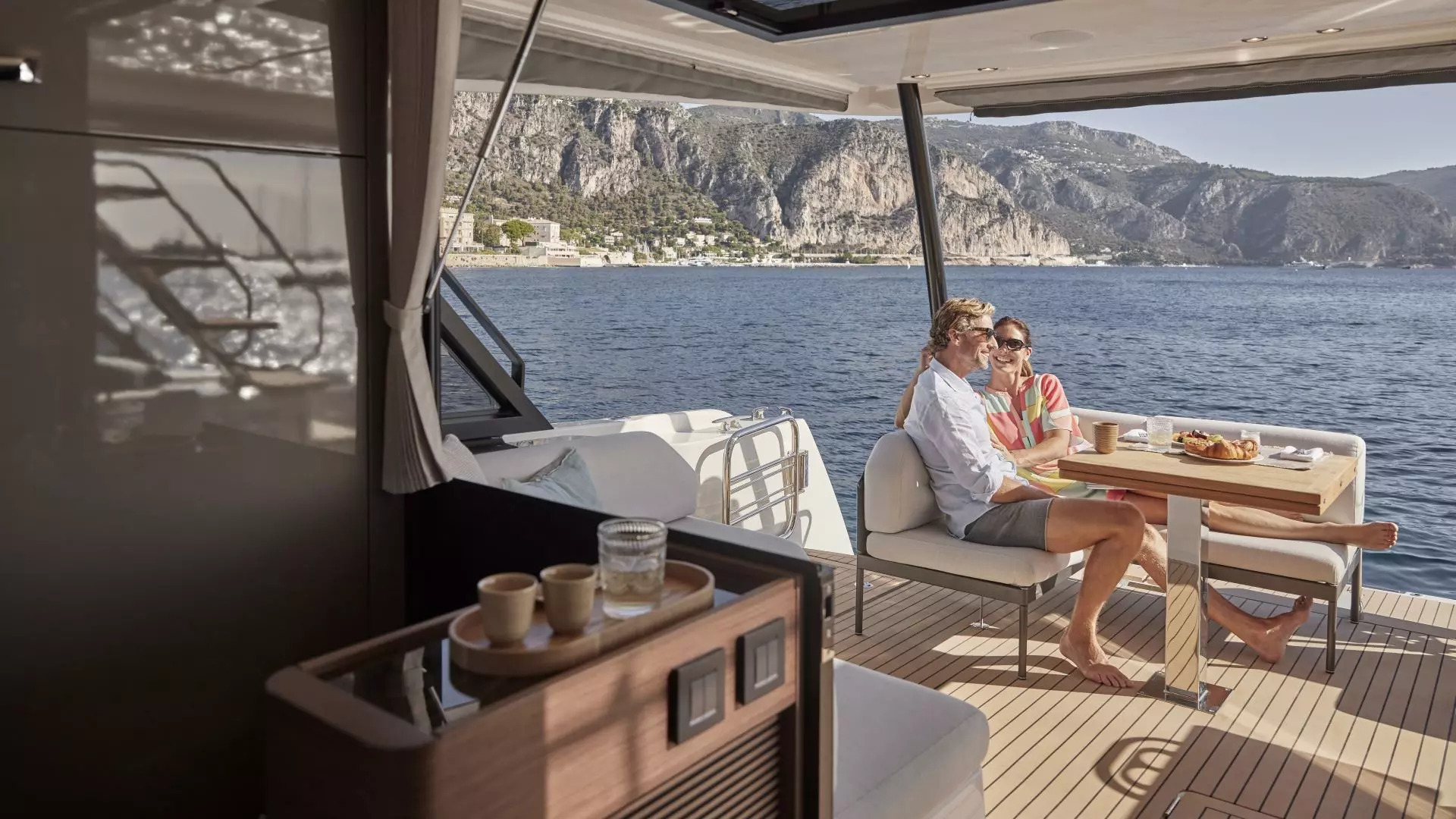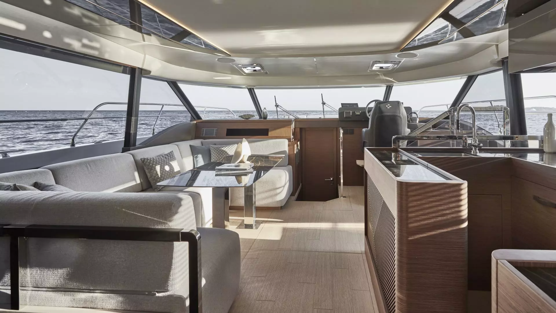 Upravljačko mjesto, smješteno lijevo ispred bara, nudi izvrsnu preglednost i sve potrebne instrumente, dok su multifunkcijski zasloni nešto manji nego u unutrašnjosti. S desne strane je još jedna sofa s pogledom prema pramcu.