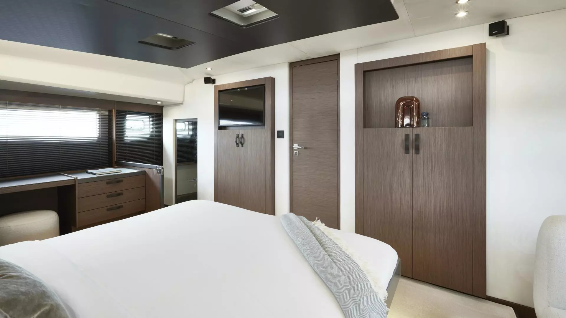 Kupaonica vlasničke kabine nalazi se u desnom trupu tri stube niže od razine kabine te dolazi opremljena s WC-om te umivaonikom, dok je u identičnom prostoru u lijevom trupu smještena prostrana tuš-kabina s još jednim umivaonikom. Vlasnička kabina vrlo je svijetla zahvaljujući bočnim prozorima smještenima tik uz sam strop kabine, a i nešto svjetlije uređenje od salona čini osjećaj prostranosti još jačim.